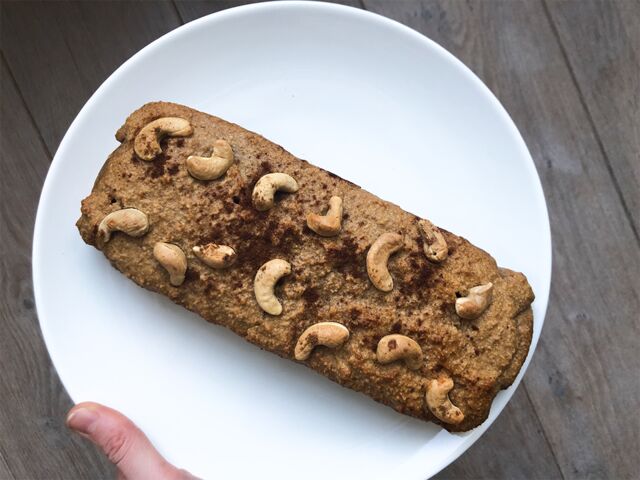 5. Giet het beslag in de bakvorm (met bakpapier). Strooi eventueel nog wat noten over je cake. Bak de cake voor 45 minuten in de oven en check tussendoor even of 'ie al gaar is of niet.
