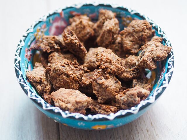 - Doe de kokosbloesemsuiker, bakpoeder, kruiden, zeezout en het speltmeel in een kom en voeg hierna de kokosolie toe.