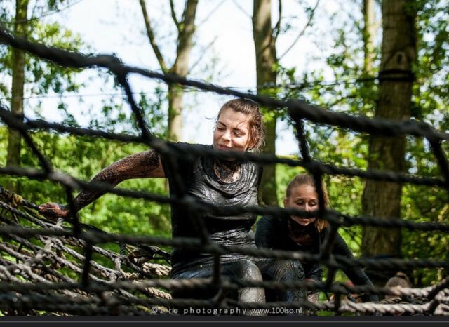Nadine had nog maar net gezegd dat we nog niet echt vies en modderig waren toen we in de verte allemaal modder-monsters zagen. Hard gelach en gegil kwam ons tegemoet en we wisten dat wij even vies gingen worden als de mensen die het water weer uitklommen. Met een kleine twijfel klommen we voorzichtig de modderpoel in waar we van top tot teen in onder werden gedompeld. Vervolgens waren we nauwelijks herkenbaar door alle modder en kropen we de laatste obstakels over. In de verte hoorde we de muziek van de finish en wisten we dat we er bijna waren.