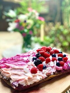 - Bedek de cake aan een kant met de bramen en doe de viooltjes ertussen.