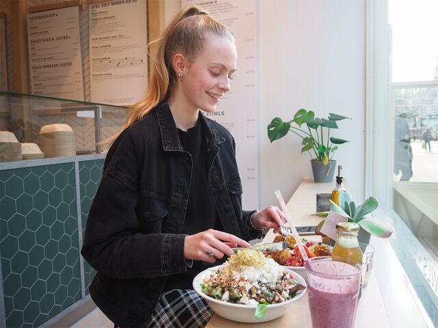 Bij SLA heb je enorm veel keuze in wat voor salade je wil. Of je stelt je eigen salade samen of je kiest een standaard salade van de kaart. Naast salades hebben ze ook soep en haver/desem brood met hummus. En als klap op de vuurpijl nog vegan 'desserts', zoals een notenreep of cheesecake. Hoe lekker is dat?!