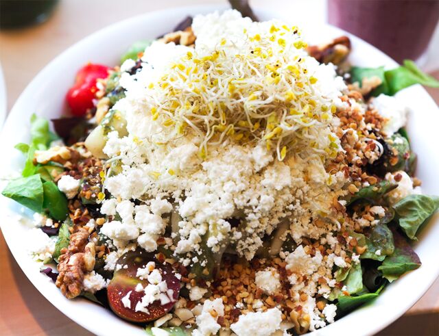 Er is zoveel keuze in salades dat het echt lastig is om te kiezen. Ik had ervoor gekozen om zelf een salade samen te stellen. Je kiest eerst een bladgroente, daarna een peulvrucht, maar dat heb ik overgeslagen, dus mocht ik een extra groente uitkiezen. Wortel, zoete aardappel, bloemkool en tomaatjes zijn mijn favoriet. Daarna kun je premium kiezen, maar daar betaal je iets meer voor. Falafel en hummus maken de salade helemaal af. Tot slot kies je een topping met een dressing erbij en dan is je salade compleet! Lisa had een biologische geitenkaas salade gekozen, dus als je van kaas houdt, moet je zeker deze nemen. Wat een heerlijke salades!