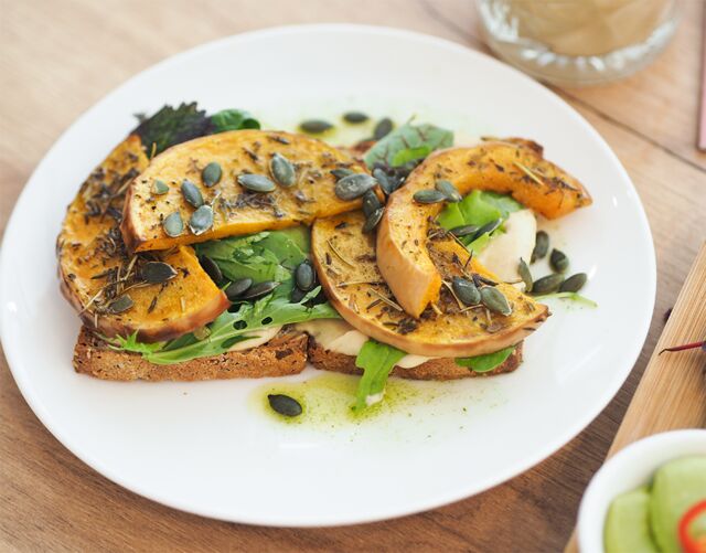 Tijd voor een heerlijke lunch! Wij beginnen met een heerlijke iced latte met havermelk, Yummy! SUE werkt samen met lokale bedrijven, en schenkt dus ook de koffie van Man met Bril (een Rotterdamse koffiebrander.) Dat vind ik een super goed initiatief! Het menu staat vol met heerlijke gerechten. Er is zoveel lekkers en ik vond het wederom erg lastig om een keuze te maken! Uiteindelijk ben ik gegaan voor de lunchplank, zodat ik van alles een beetje kon proeven. Zo’n lunchplank is zeker aan te raden, want je krijgt een klein soepje, een toast met avocado crème en kerrie hummus en twee verschillende salades. Daarnaast namen we ook nog de toast met hummus en geroosterde pompoen en dat is ook zeker een dikke aanrader! Wat een heerlijke, gezonde lunch!